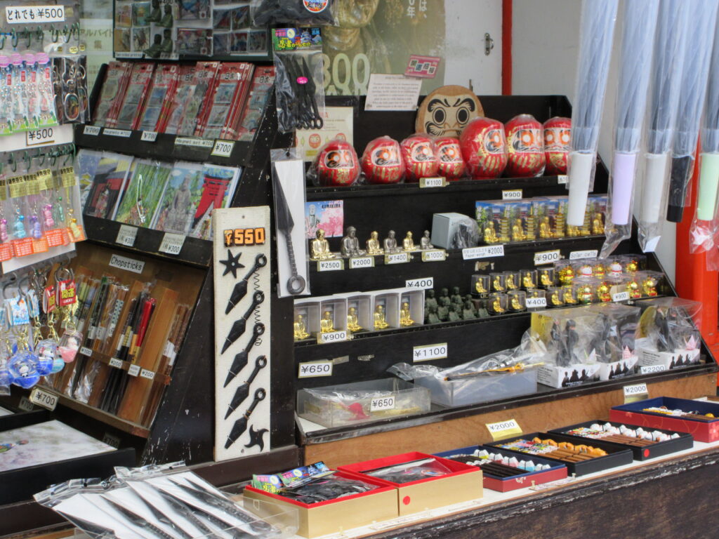 古くからの観光地でよく見かける定番のお土産。鎌倉大仏近くのお土産店は、定番のキーホルダーやT-シャツの他、手裏剣などの忍者グッズがたくさん。外国人観光客が多く来店していました。鎌倉みやげの定番、金の大仏と塔の模型も。これは、いろいろな観光地で見かけますね。