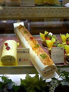 「長過ぎる桃ロール」はその名の通り長い、長すぎると言っても過言ではない長さで。斜めに入れないとショーケースに収まりきりません。