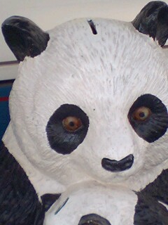 一方、パンダは目が充血していて顔も凄みがあります。このパンダ、WWF(世界自然保護基金)の寄付を促す貯金箱なのですが、「絶滅させたくなくば、金をいれよ」と言われているようで、思わず小銭を入れました…。