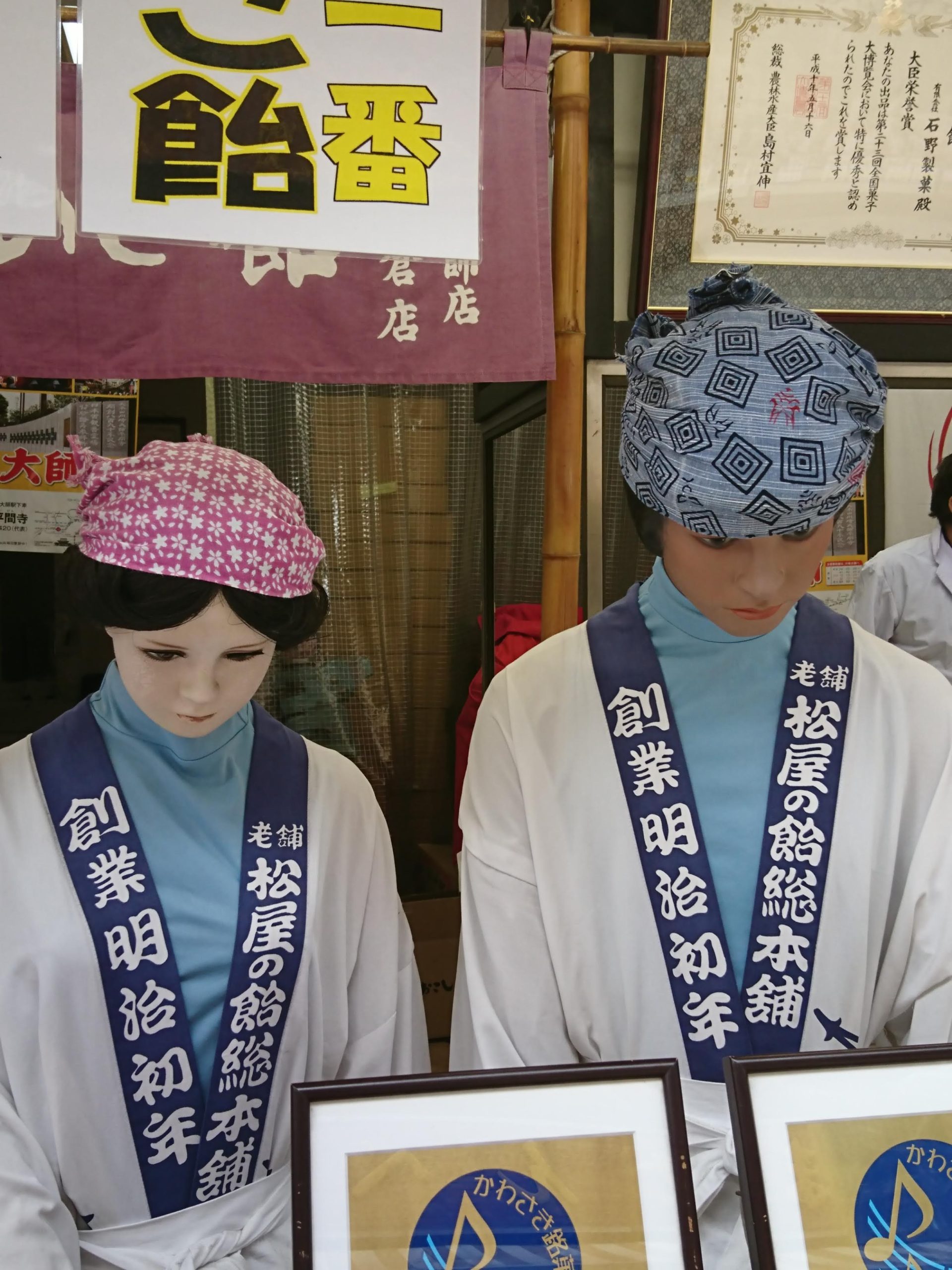 川崎大師門前の飴屋さんで見かけた、うつむいている男女の従業員。よくみるとこの2人、人形なんです。お客がくると電源が入るようで、ゆっくり顔をあげます。ちょっと怖いです。